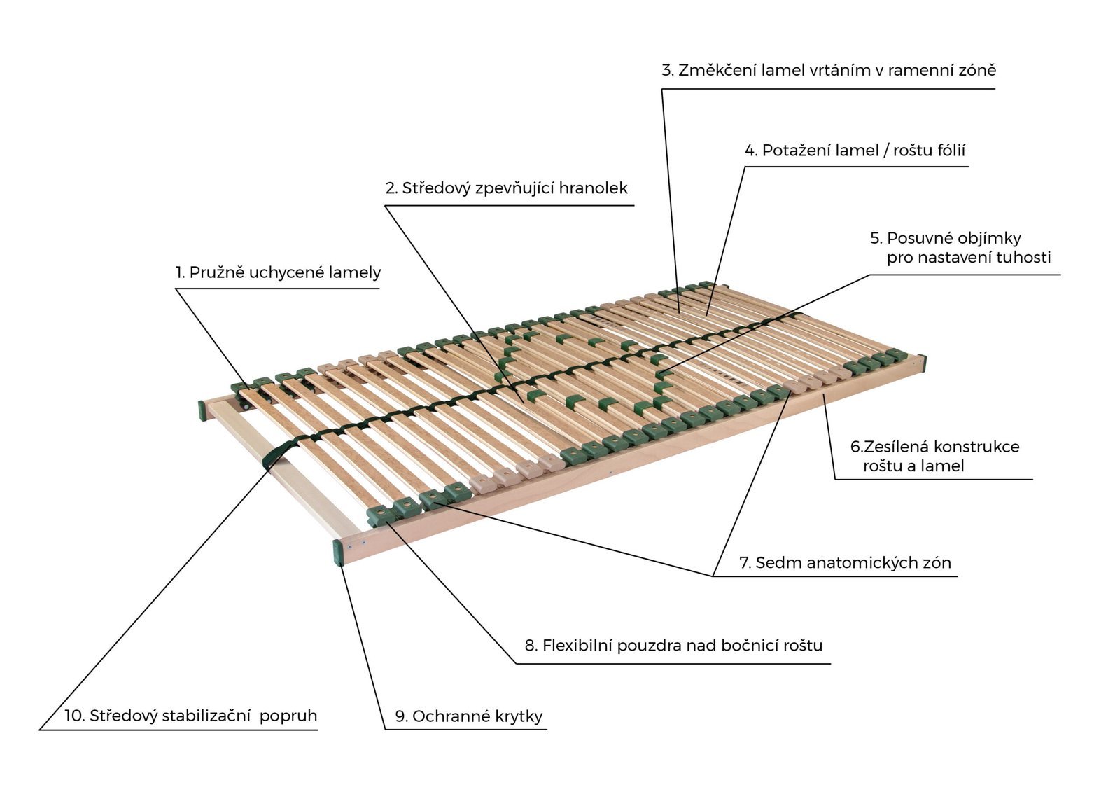 Díky zpevněné konstrukci a silnějším lamelám je tento rošt přizpůsoben pro vyšší zátěž, až 150 kg. Postelový rošt s bočním výklopem pro přístup do úložného prostoru řeší nedostatek místa v ložnici. Zdvih pomocí textilního úchytu usnadní každodenní manipulaci. Speciálně uložená výkyvná pouzdra zaručují vyšší nosnost a odolnost proti prudkému zatížení. Rozdělení roštu do 7 anatomických zón umožní optimální oporu v oblasti hlavy, ramen, trupu, beder, stehen, lýtek a chodidel. Frézované lamely v ramenní oblasti poskytnou správnou oporu páteře při poloze spánku na boku. Středový popruh zlepšuje stabilitu a vyrovnává zatížení roštu.